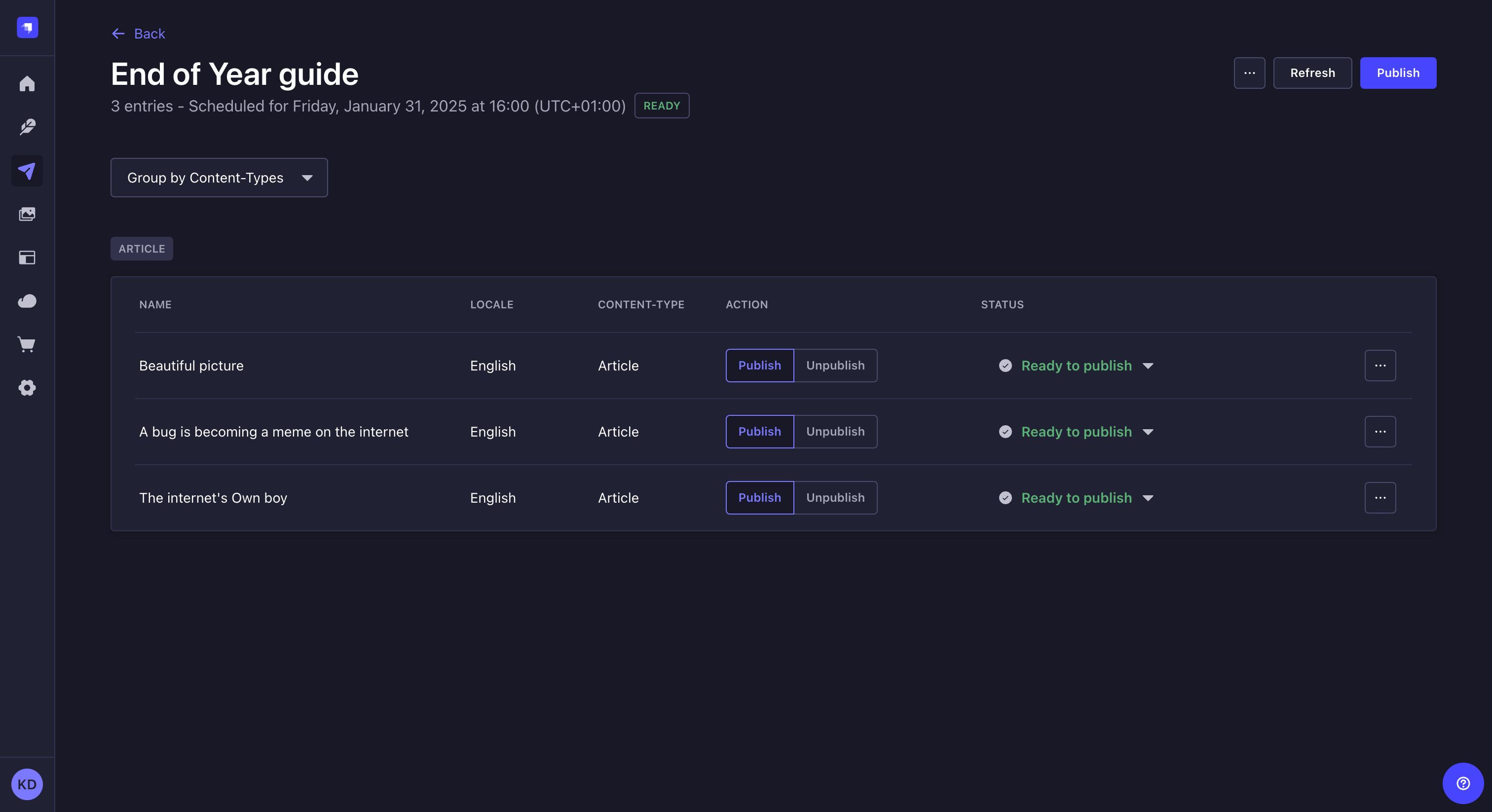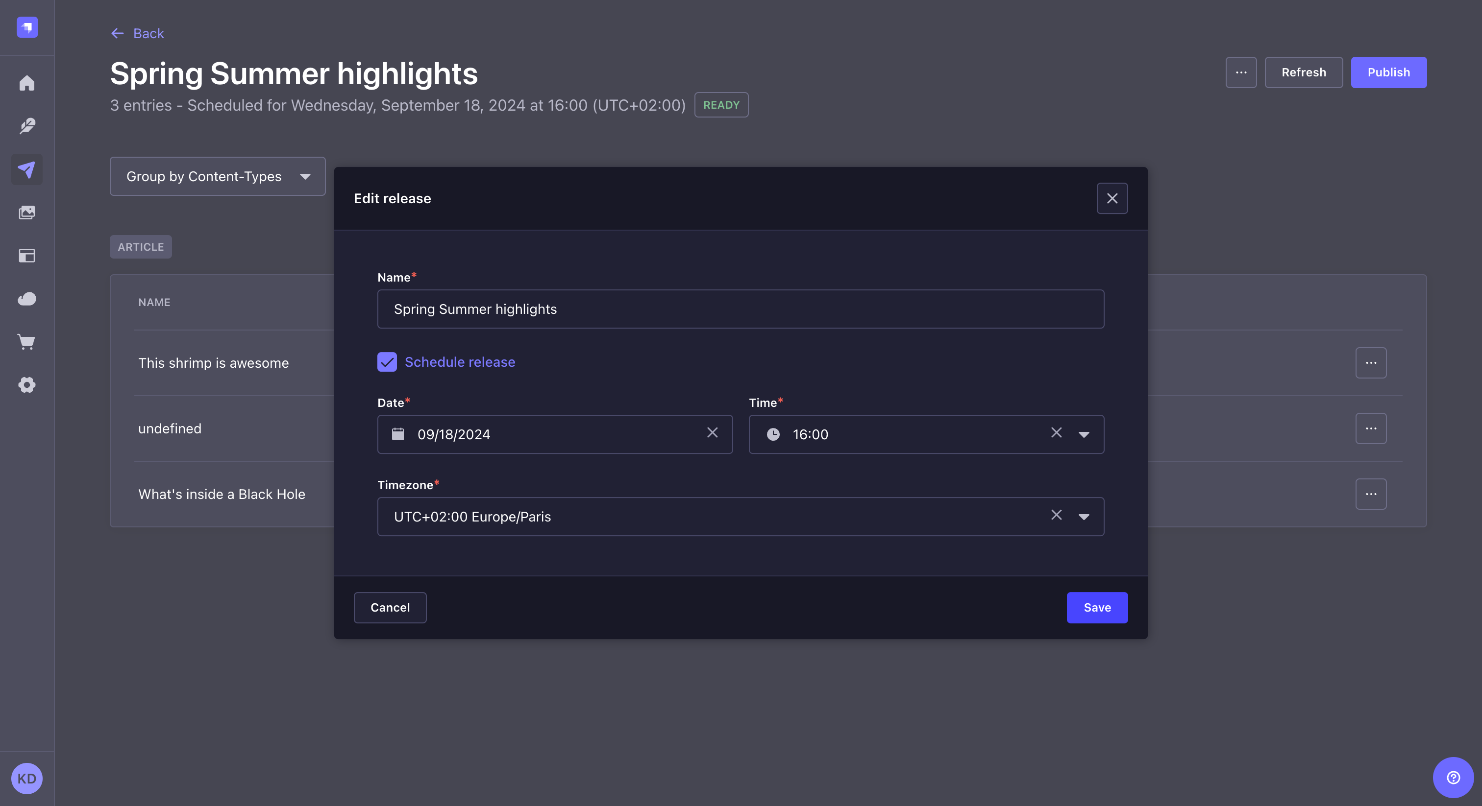 The Releases feature enables content managers to organize entries into containers that can perform publish and unpublish actions simultaneously. A release can contain entries from different content types and can mix locales.